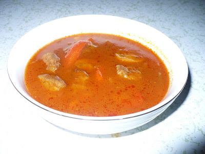 Brown the stew meat in the olive oil in a large pot. Season it with salt and pepper. Then add the sliced green, red bell pepper and onion. Season with the paprika. Add the fresh sliced mushrooms and cook all the vegetables with the meat on medium heat for a few minutes until the onions are golden. Add the tomatoe sauce, red wine, water and bouillon cube and let it all cook for at least an 1 - 1/2 hour. Season with salt and pepper if necessary. Serve with your favorite bread, potatoe dumplings (German recipe - maybe later;), or mashed potatoes. Enjoy!